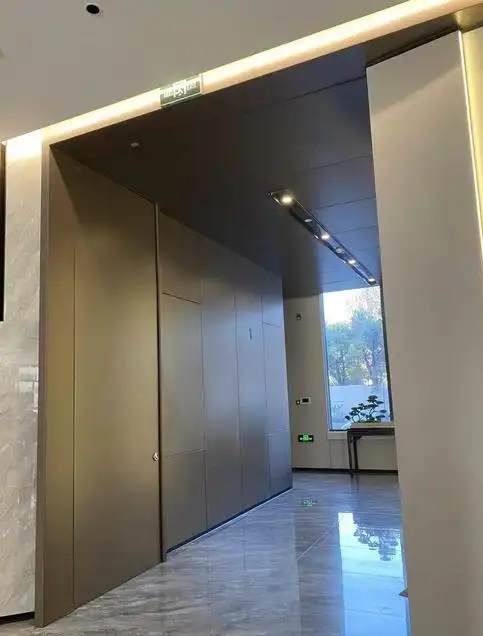 1、隱藏折疊防火門采用多扇折疊組合設(shè)計,通過鉸鏈連接形成可收折的門扇單元,配備自動關(guān)閉裝置,火災(zāi)時高溫觸發(fā)自動閉門功能,無需人工操作。